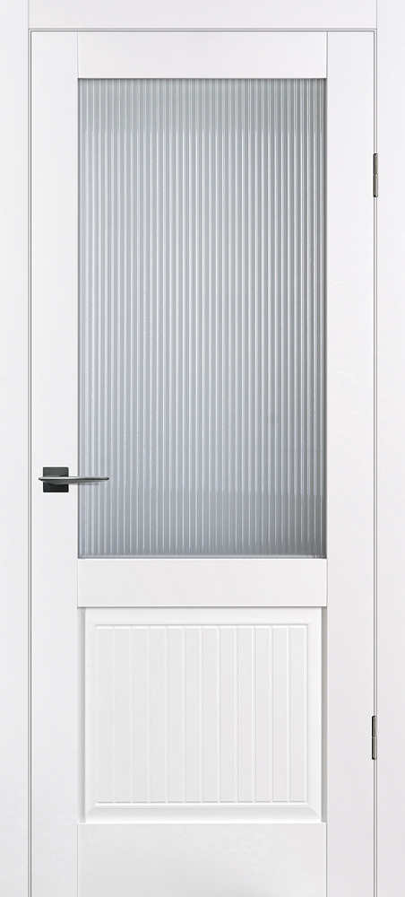 Полотно комплектуется объемной филенкой с фрезерованным рисунком "под рейку". В остекленных полотнах используется рифленное стекло с красивым прокатным узором в виде полос. Отлично смотрится в неоклассических и лофтовых интерьерах.